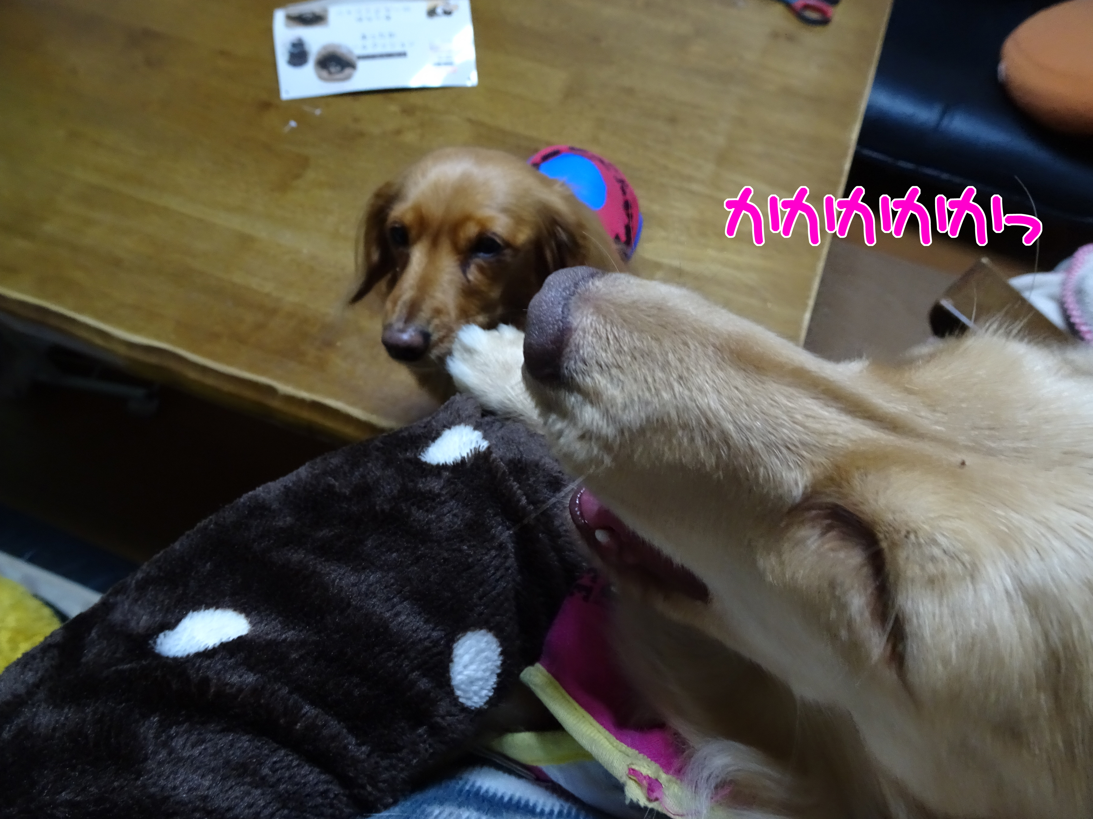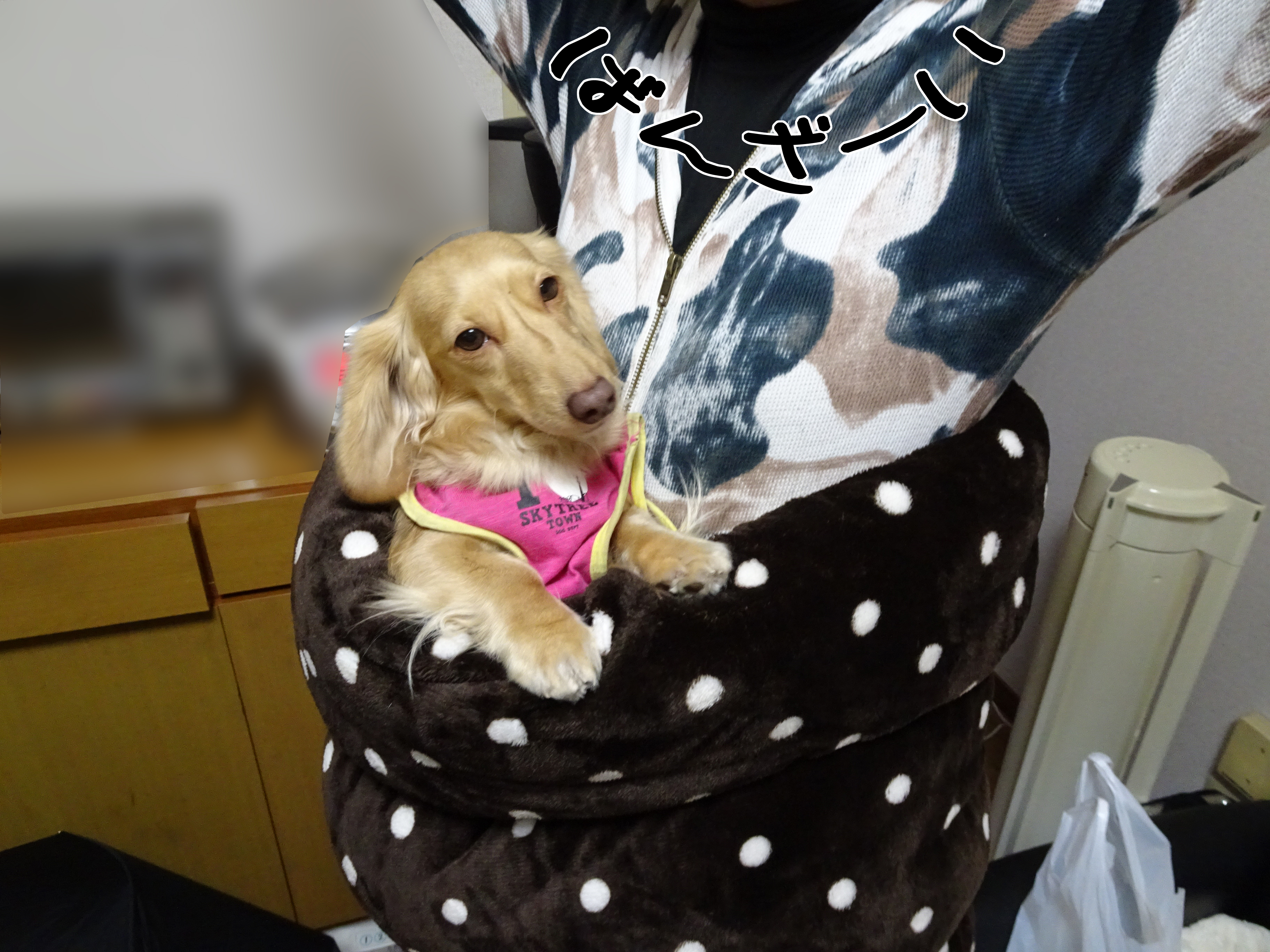これが噂の・・・・ 2016年12月28日00:00 カテゴリ:お買物今日のワンコ とあるところに 室内用スリッパを買いに行ったら こんなモノ買ってしまった 激安勝負の「し❍むら」にして この価格は高級品 売れ筋商品なんだろう 「どこに行っても売り切れで~」とか 聞いてたけど 今日は山積みになってた アタシはもう 『周回遅れ』なんだろうな あ、ロコが入った モコと揉めてます 抱っこ虫の多い我が家では こういう使用方法が良いですな カニヘンモコちゃんは こんなことしても落ちない 暖かくてgood! でもやっぱり メルちゃんが 一番しっくりきます 付き合いが長いので・・・ 寒い寒い~ 「お買物」カテゴリの最新記事 タグ :#しまほい#ロールクッション < 前の記事次の記事 > コメント コメント一覧 (2) 2. ぐりひな 2016年12月28日 16:34 昨年から火がついた「しまホイ」ですねぇ、ウチも今年夏終わりに購入しました(^^) 私が買った時は冬物が入り始めた時で、入れば売れるで1コしかなくて、不本意ながらピンクをかったんですよね💨 にしても、ママさん細いなぁ。 私しまホイに自分が入ったらワンコは入らないかも…(;^_^A モコちゃんのカカカッ笑いもかわいいけど、今日の1番はメルちゃんの満足顔かな(*^^*) 1. レオンのかあちゃん 2016年12月28日 05:51 これ 去年から 流行ってるらしい 私が知ったのは マロン君ち みごとに ルーク君は潜ってますよね 流行ると 似たような物が あっちこっちで売られます 娘の勤め先でも・・・・・・ こっちは ファスナーが付いてて ひざ掛けに出来ます 筒型だとね 人間にはトイレの時 いちいち 脱がないと行けない アリスは 一緒に潜るときついし毛布掛けてもらう方がすき なので 姉ちゃんの休みの日 掛け布団として 活用しています 一旦売りきれたけど 再入荷 今1000円引きで売ってるらしい 置いてあると レオンが 敷物として利用 暖かい事は間違いないようです 潜ると 全身暖かいんだろうけど うちの子たちは 潜ると言う観念がないようで 只の毛布ですね 今日は一日10度ない気温 パパさんも巻いてみる? コメントフォーム 名前 コメント 評価する リセット リセット 顔 星 投稿する 情報を記憶