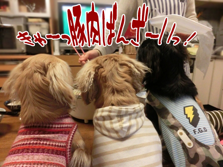 鍋と犬。 2015年01月28日00:00 カテゴリ:その他 豚肉と白菜が安かったので 今夜は鍋。 勝手に盛り上がってる ワンコたち。 そ。 小振りだけど1玉80円。 朝、市場で買いました。 豚肉も卸値だから お買い得。 膨らむ期待。 こちらも期待。 茹でたのをお湯で洗って