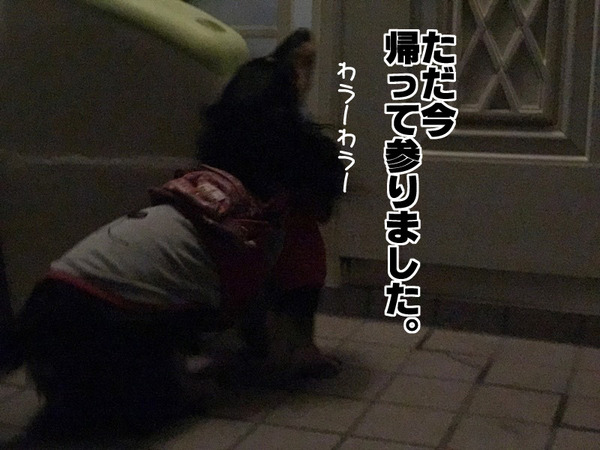 どん帰る。 2017年11月28日00:00 カテゴリ:どん兄妹 先週の木曜日から弟ルークの家にお泊りに行っていたどん君。月曜日夜9時にルークママの車で帰ってきました。ママが一人でバス通りまで迎えに行き玄関に到着。家の中ではパパがこの様子を撮影してました。ドアを開けました。『お帰りの舞』。嬉しいくせにちょっとプリプリ。