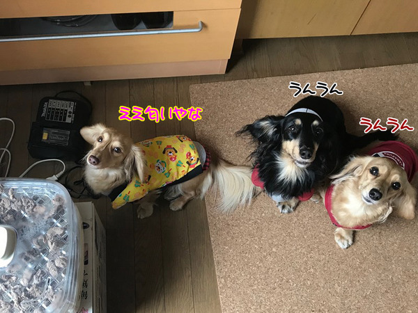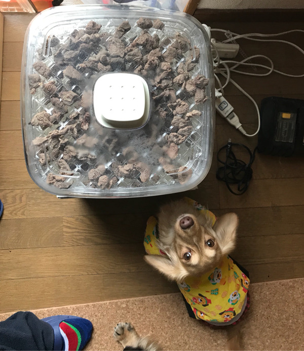 鹿肉その後。 2017年11月29日00:00 カテゴリ:その他 今朝、鹿肉がスライスされてドライフードメーカーに並んでました。『生だとちょっと・・と思ったんで1度茹でたんだ』と、パパが言ってました。モコちゃんお約束の寝ずの番かと思いましたが鶏肉にくらべると水分が少ないらしく夕方にはすっかり出来上がり。ずーっと見守って