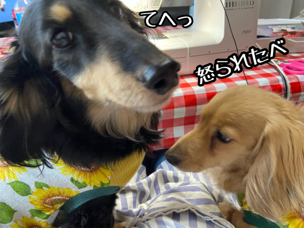 パパに叱られたわんこ。 2021年05月02日00:00 カテゴリ:ロコどん 朝から雨が降ったり止んだりで結局お散歩に行けずお家の中で走り回ってテンション上がりすぎてワンワン大騒ぎしてパパの足もとでワンプロ初めてドッカーンと叱られてママの所に逃げてきました。見切れてますが足もとにはモコ背中にはメルが貼りついてます。へっへーんだ、と