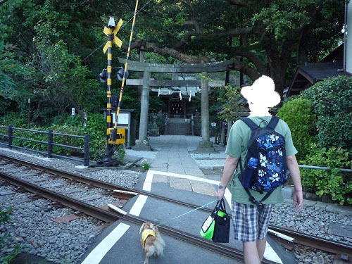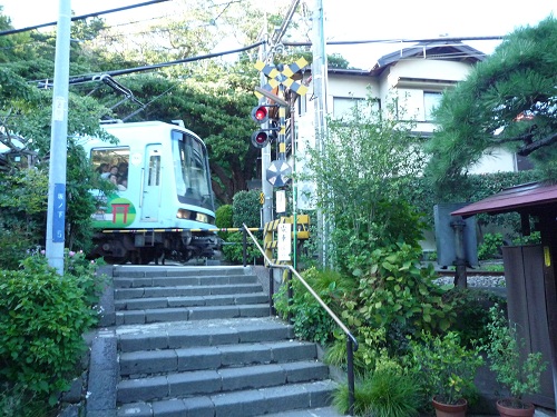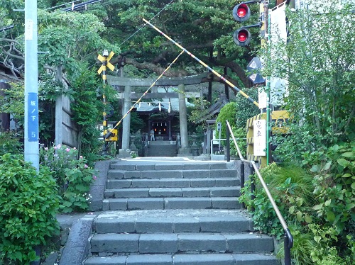 実はこれ神社の参道を江ノ電が横切る風景なのです。