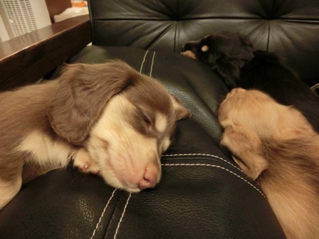 家族写真。 2013年08月05日00:59 カテゴリ:子育て 日曜日。 遊びほーけてたママは 撮れ高ゼロです。 とりあえず 寝てるチビーズを。 ケージ無しで育ててるモンで ソファはとうに 陥落しました。 これからますます大きくなって ソファはワンコでてんこ盛り… どーしましょ